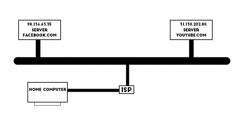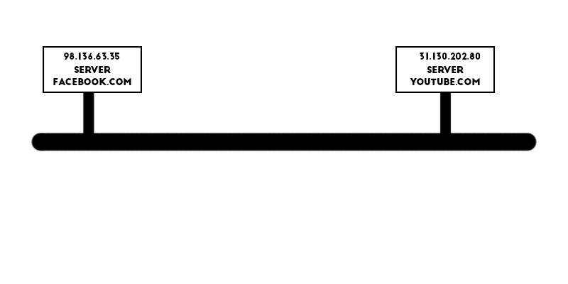 There are also servers connected to this wire. These servers hold web pages and host them. Each of these servers have an IP address, which consists of numbers and dots. These addresses are given names people can actually remember and connect to, e.g facebook.com, youtube.com, etc.